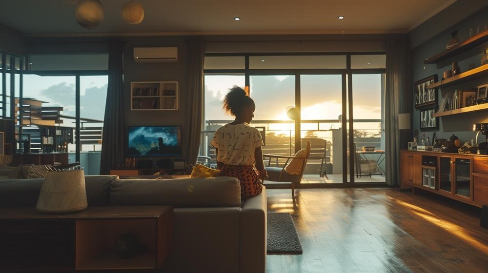 PROMPT: a cinematic scene from african comedy movie, middle shot, modern Kenyan bachelor's apartment, captured by arri alexa, wide angle, anamorphic lens, film directed by Rainer Werner Fassbinder, evening light --ar 16:9 --style raw --v 6.0